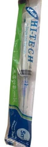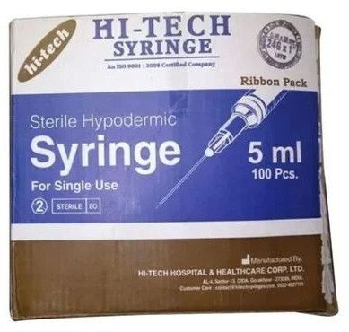 Introducing the Hi-Tech 5ml Syringe, a reliable clinical tool made of durable plastic with a steel needle for precision. Each transparent syringe comes in a pack of 100, conveniently stored in a paper box. Proudly made in India, this syringe has a capacity of 5 ml, perfect for medical professionals and healthcare facilities.